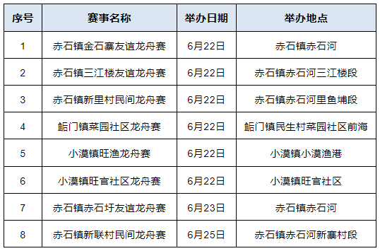 注:赤石镇龙舟赛最佳观看点为赤河广场、鹭月岛,鲘门镇龙舟赛最佳观看点为蓝海大道,小漠镇龙舟赛最佳观看点为小漠渔港。