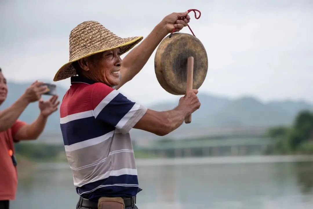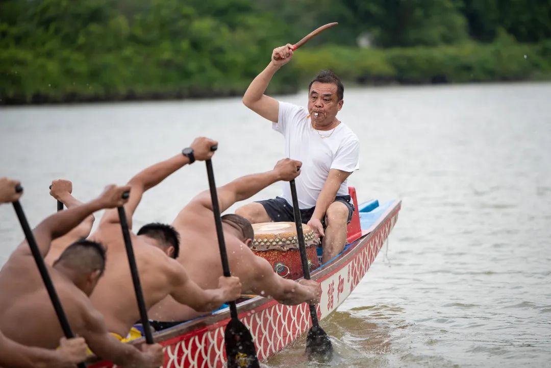 “本地划龙舟,流传着一句俗语,赛龙舟父子互不相让,谁都不甘示弱。”今年71岁负责敲铜锣的村民刘火安提高嗓门,赞叹着龙舟竞渡的魅力。刘火安是岸上的总指挥,年轻时曾是一名划龙舟好手,如今是村里龙舟赛的“老牌”教练。儿子刘佑铭打小耳濡目染,已成长为龙舟队的主力。