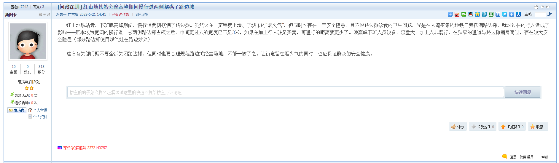 网友如有相关诉求、建言和意见的,可直接在深圳论坛“我说深圳事”栏目发帖进行报料、投诉,或者通过官方报料QQ以及问政热线等渠道反映诉求。