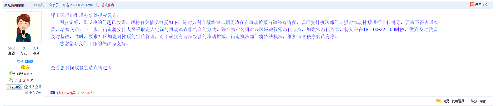 各职能单位如需对网友反映的问题进行回应,可在深圳论坛注册官方账号并通过认证,回帖进行回应,也可通过客服QQ以及热线电话,委托深圳论坛代为回应。
