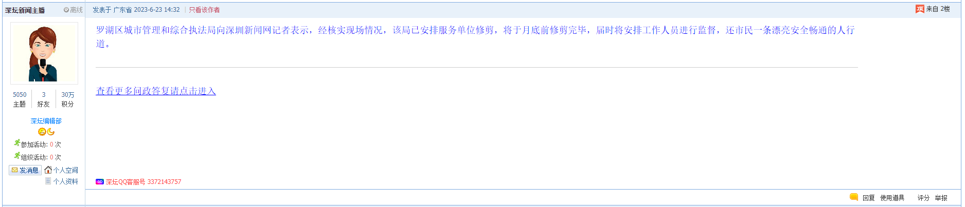 2、帖文《罗湖区文锦南路绿化该修剪了》