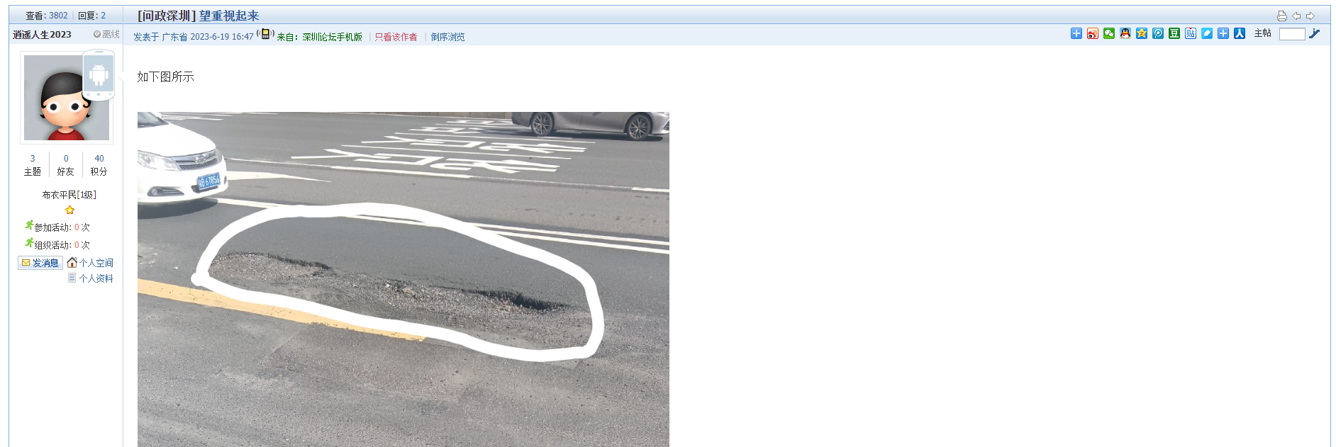 1、帖文《道路坑洼》