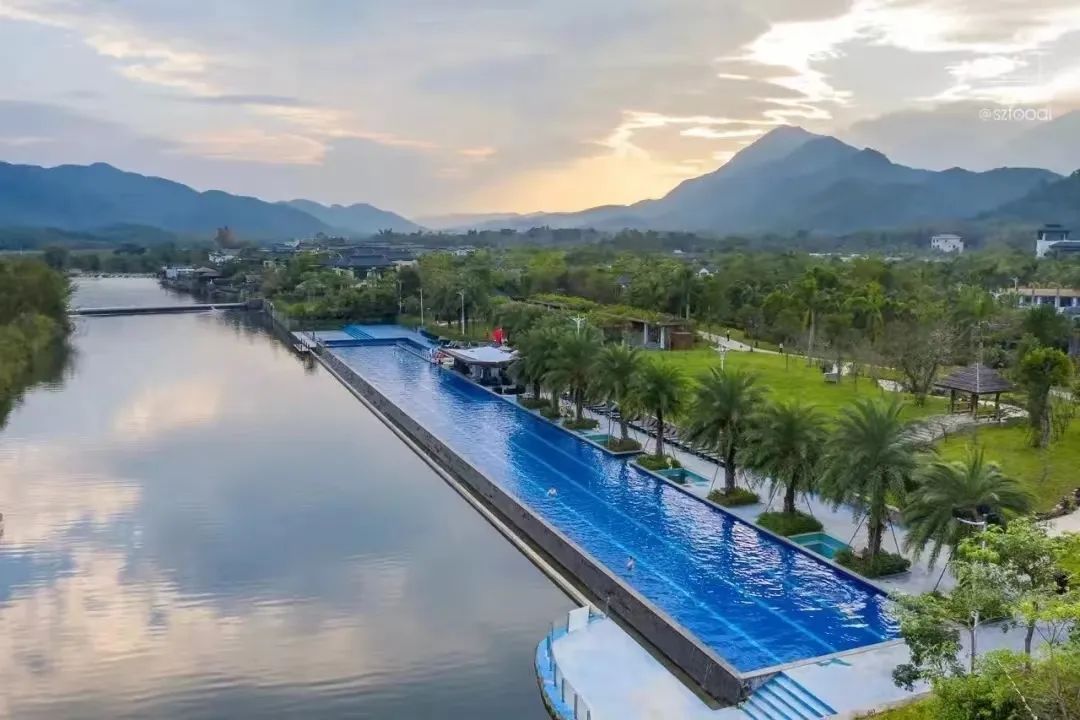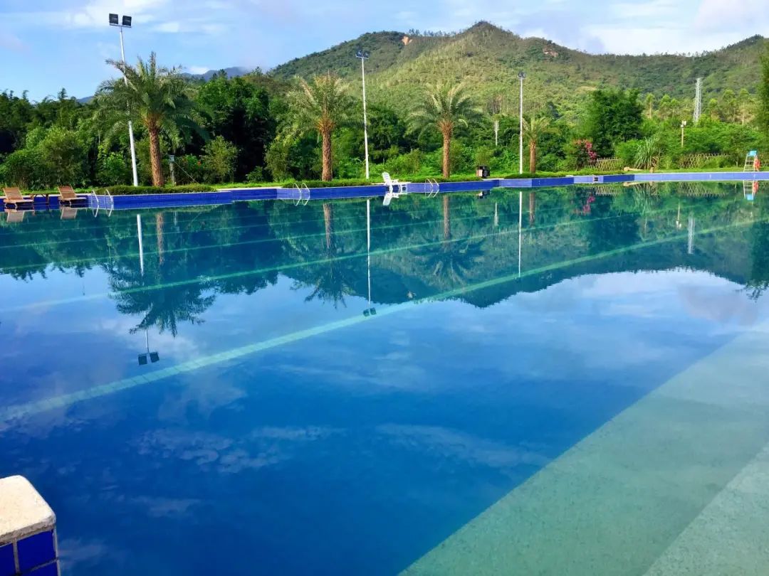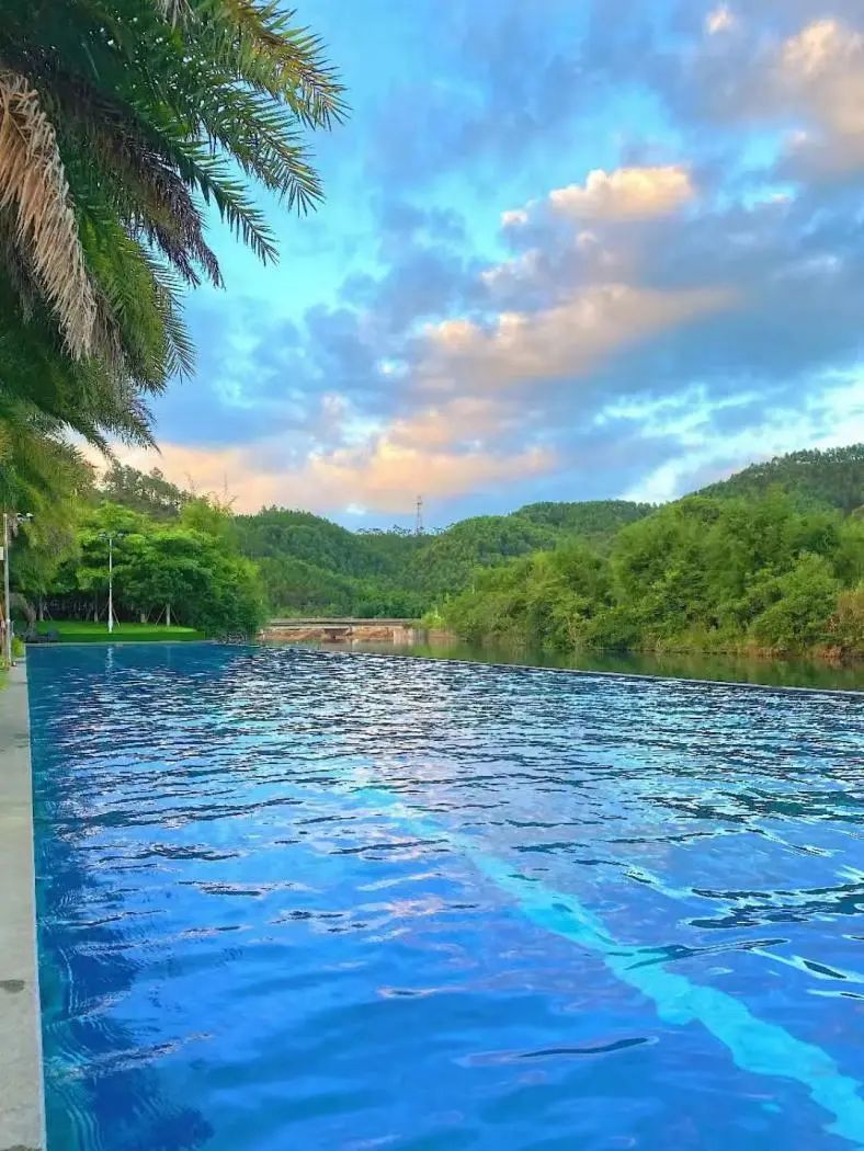 水底山温泉庄园的温泉泳池,绝对是这座超大庄园里最受欢迎的设施之一。泳池全长108米,共4个泳道,呈现出让人眼前一亮的湛蓝色。泳池毗邻河畔,仿佛与自然融为一体,难怪被称为“无边泳池”。
