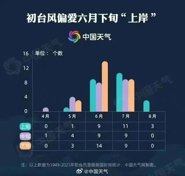 中国天气网盘点了1949年至2021年的初台风数据,首个登陆我国的台风多集中在6至7月份,这两月初台风登陆我国的比例高达83%,其中,在6月下旬登陆的比例最高,达14次,7月上旬位列第二,达11次。