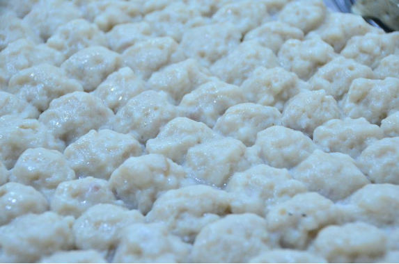 完成调味后,就可以开始搓丸。搓丸讲究的是手法和力道,要用力反复揉搓、拍打鱼肉,中途不能停,直到鱼肉成糜状且微黏手才算是“火候”到家了。一只手从大盆里轻轻剜起一团鱼肉糜,一挤一攥,一颗晶莹的鱼丸从虎口挤出,另一只手则快速拿小汤勺刮至蒸片上,熟练者速度极快,甚至无需汤勺辅佐。最后上锅蒸四十分钟,富有弹性,味道鲜美的马鲛鱼丸便大功告成,除了直接食用,还可以作为“炒、煎、煮、煲”的原料再做加工。