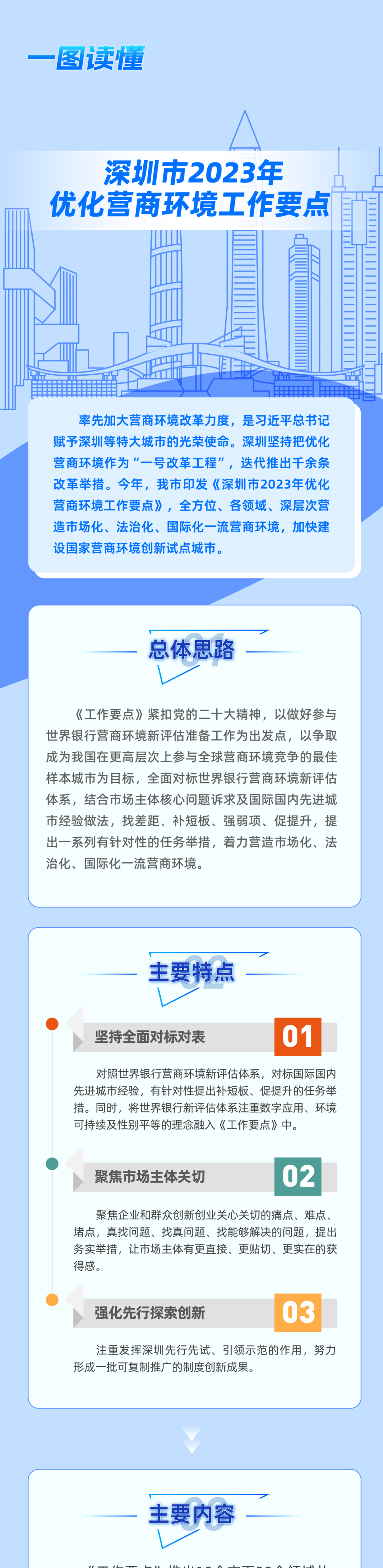 外商投资企业登记“一窗通办”、推行“一照多址、多址监管”模式、开展科技人才分类评价改革试点、建设不少于20家具有深圳特色的线上线下零工市场……7月19日,《深圳市2023年优化营商环境工作要点》(以下简称《工作要点》)发布,围绕优化市场准入环境、保障企业获取经营场所、提升就业公共服务质量等领域,推出10个方面共100项重点任务,聚焦市场主体的痛点、难点、堵点,全方位、各领域、深层次营造市场化、法治化、国际化一流营商环境,为市场主体高质量发展、全球高端要素不断汇聚提供更好保障和支撑。