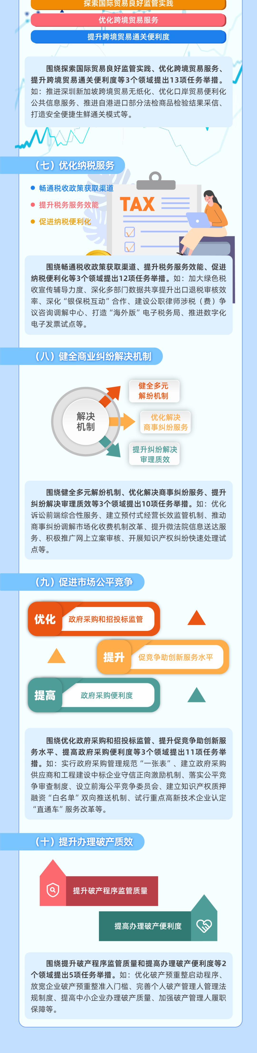 记者了解到,此次《工作要点》全面对照世界银行营商环境新评估体系,共分为市场准入、获取经营场所、市政公用基础设施报装、劳工、获取金融服务、国际贸易、纳税、解决商业纠纷、促进市场竞争和办理破产10个指标领域,同时,将世界银行新评估体系注重数字应用、环境可持续及性别平等的理念融入其中。