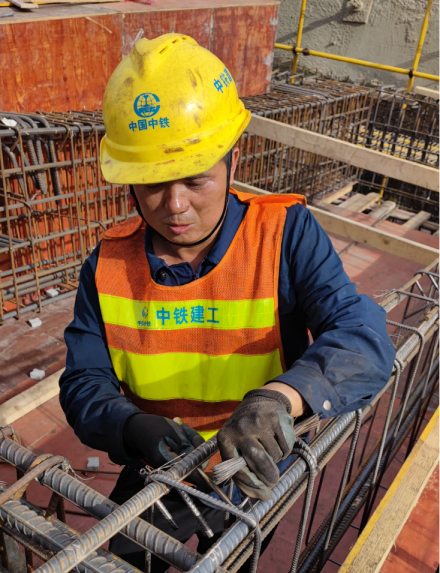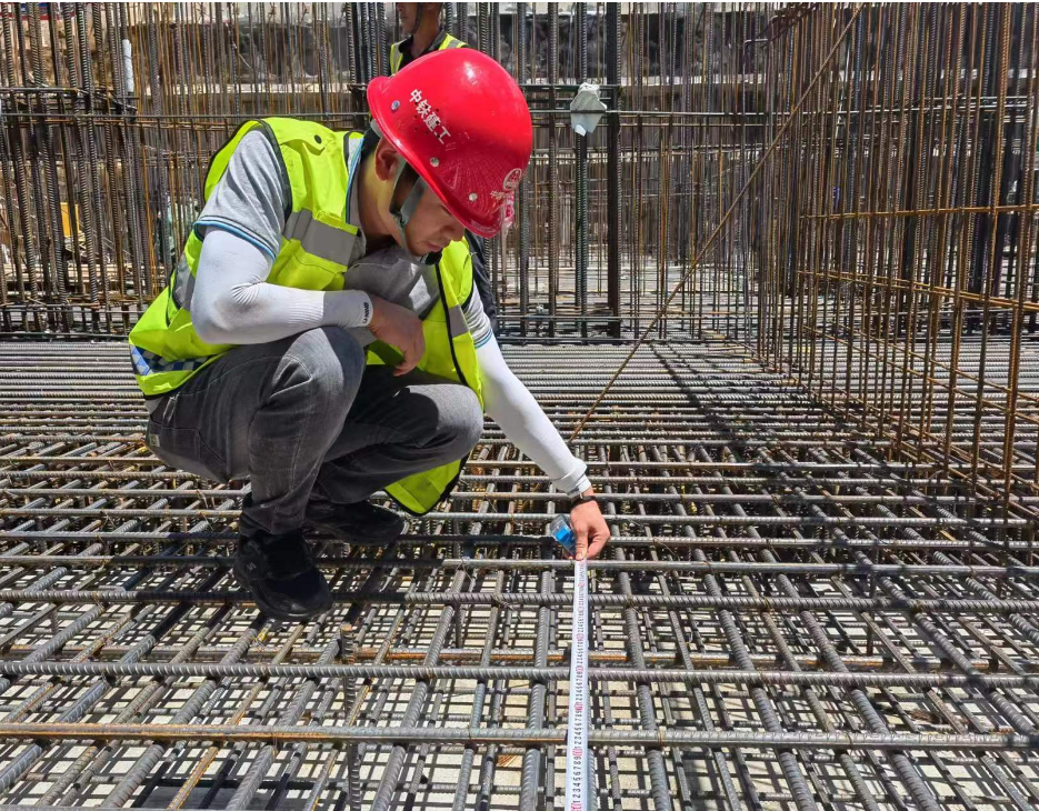 他和工友们要抓住滚烫的钢筋,严格按照图纸尺寸和间距,一根一根地将钢筋绑扎固定起来。