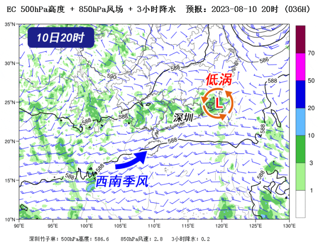 △EC数值预报显示低涡逐渐靠近珠江口