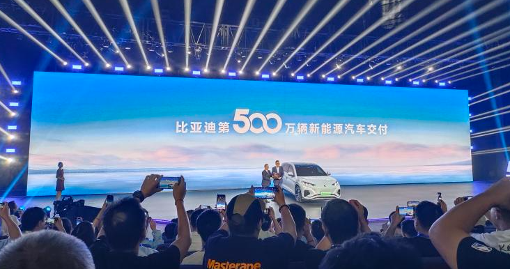 “这是属于比亚迪的高光时代,也是属于中国品牌的高光时代。”8月9日晚,比亚迪股份有限公司董事长兼总裁王传福在深圳全球总部宣布,比亚迪第500万辆新能源汽车正式下线,成为全球首个达成这一里程碑的汽车品牌。
