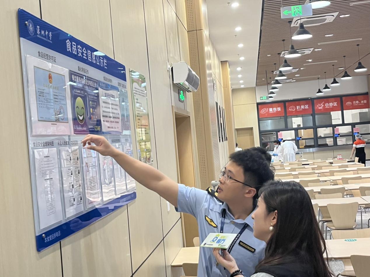 在食堂用餐区,执法人员依次查看食品安全公示栏、明厨亮灶系统、用餐区域消毒记录等信息。检查过程中发现部分从业人员健康证即将到期,深圳市市场监督管理局罗湖监管局执法人员罗伟仁提醒,为保护从业人员自身及服务对象的健康,应尽快更新办理从业人员健康证。
