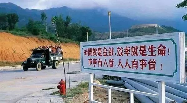 1981年,“时间就是金钱,效率就是生命”巨型标语矗立在蛇口工业区。