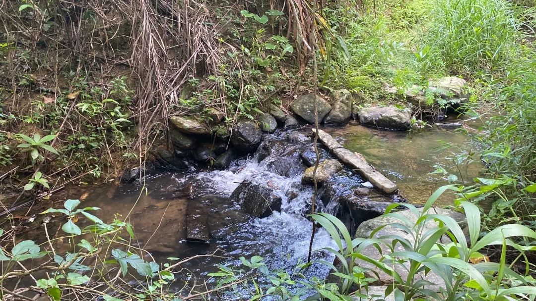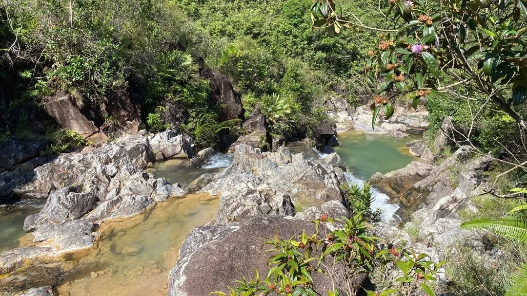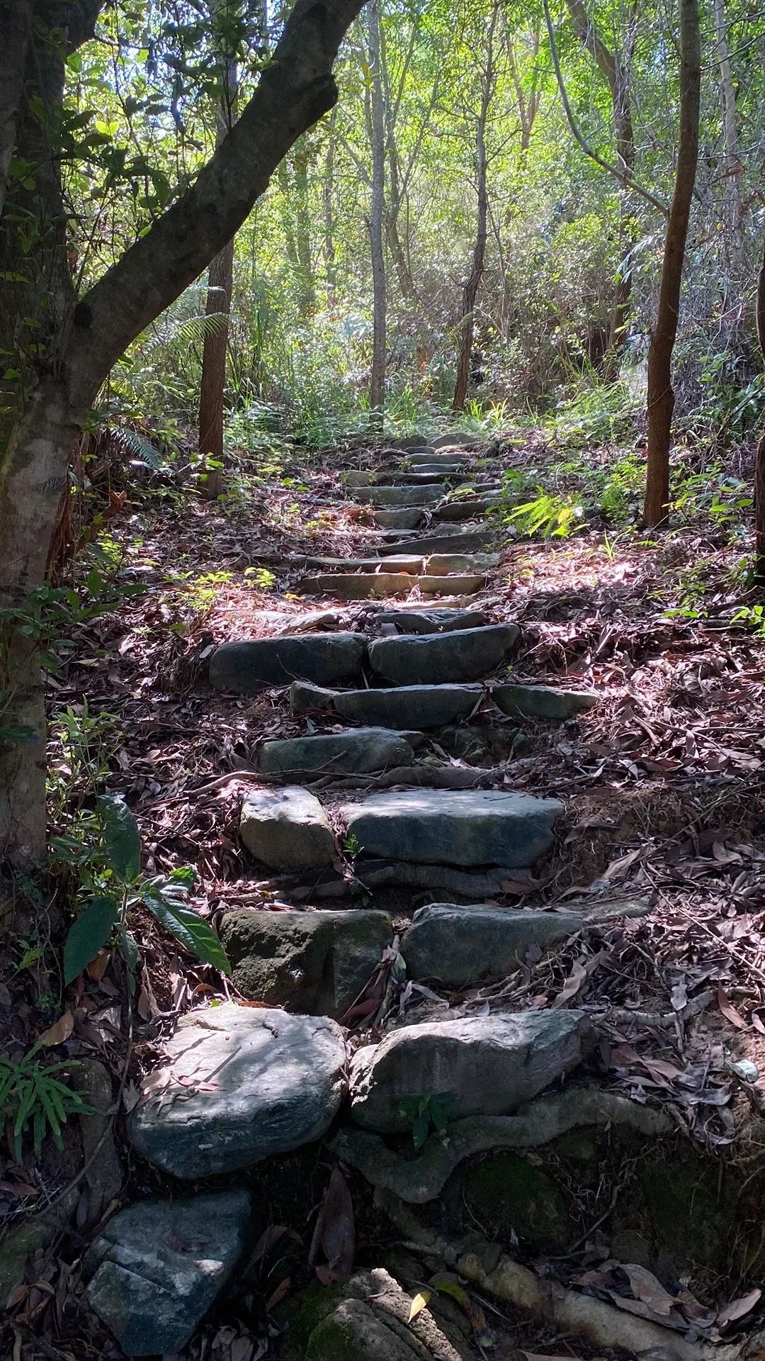 脚下的石阶长满了青苔,树根从缝隙中钻出,各种藤蔓盘踞在树干上直达树冠,空气都变得湿润。溪流顺着古道边流淌,盘旋而下的水流好几次挡在路前,不得不涉水跨过。捧一掬清冽的溪水洗把脸,神清气爽。但此处的溪流边有不少桉树,万不可饮用溪水,否则会有致幻的风险。