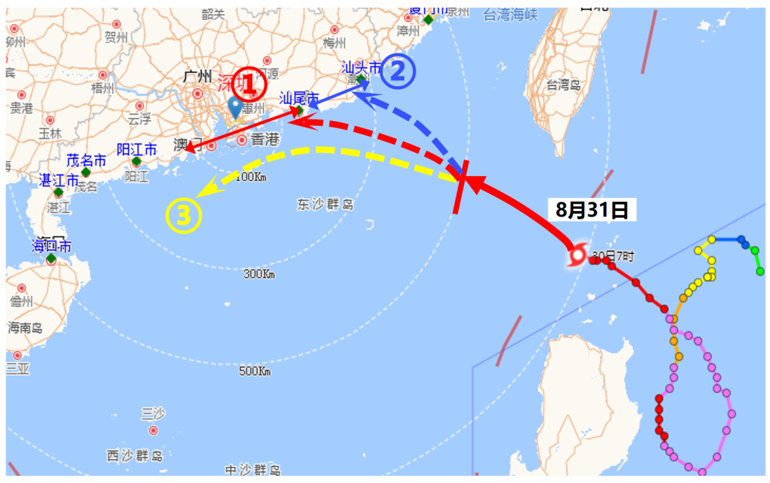 结合各大机构最新预测,市气象局深汕气象服务工作组研判,8月31 日台风“苏拉”移入南海后其路径和影响有三种可能: