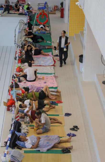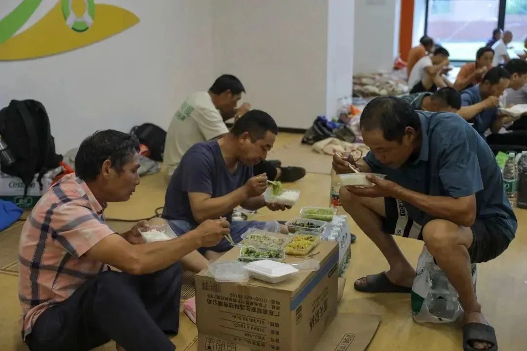 工友们,台风来了,住在工棚不安全,跟我们到安置点避险吧。