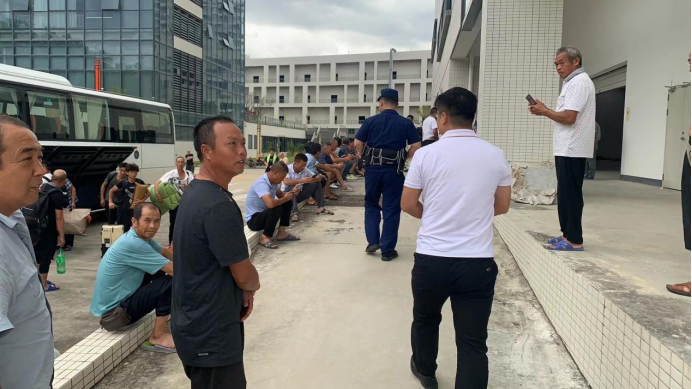 △大巴接运建筑工人前往避险点。