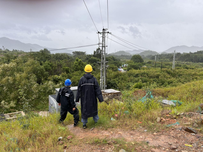 深汕供电局人员台风来临前巡视片区边坡线路,“风里雨里,供电蜀黍穿着雨衣逆风前行守护你”。
