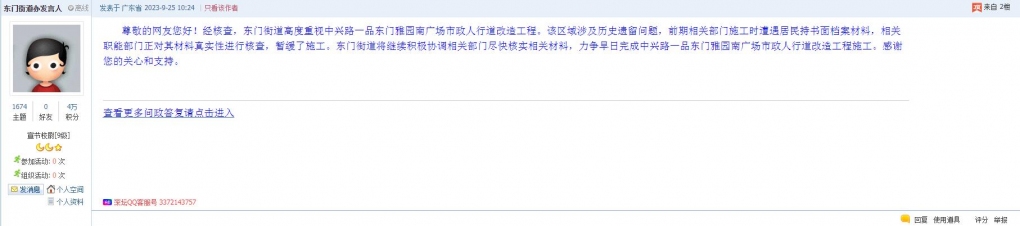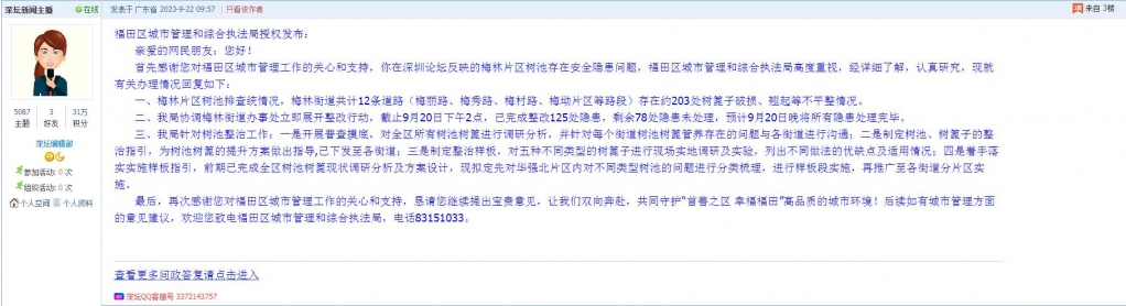 各职能单位如需对网友反映的问题进行回应,可在深圳论坛注册官方账号并通过认证,回帖进行回应,也可通过客服QQ以及热线电话,委托深圳论坛代为回应。