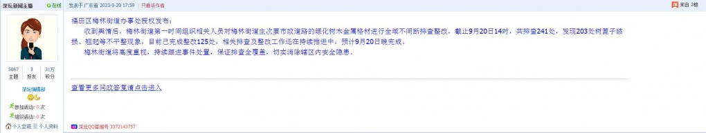 收到舆情后,梅林街道第一时间组织相关人员对梅林街道主次要市政道路的绿化树木金属格材进行全域不间断排查整改,截至9月20日14时,共排查241处,发现203处树篦子破损、翘起等不平整现象,目前已完成整改125处,相关排查及整改工作还在持续推进中,预计9月20日晚完成。