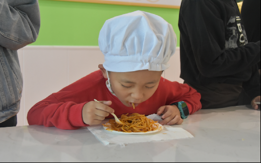 每2-3名同学为一组进行比赛,共同完成意面的制作。