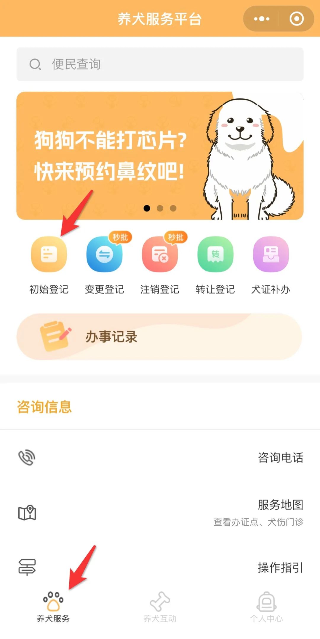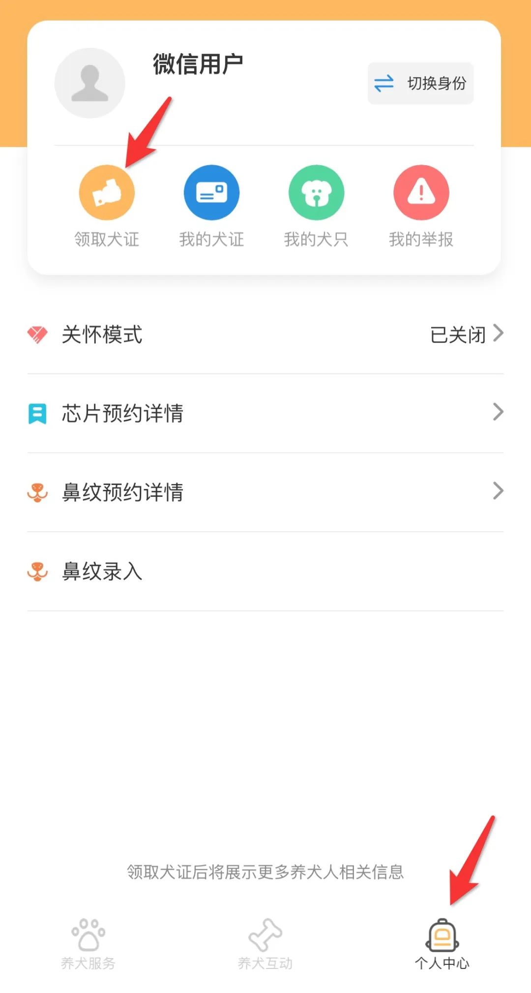 微信登录小程序后点击“个人中心”→“领取犬证”→填写信息后领取