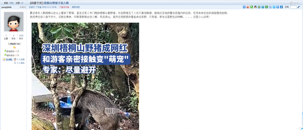 6、帖文《梧桐山野猪不怕人啊》