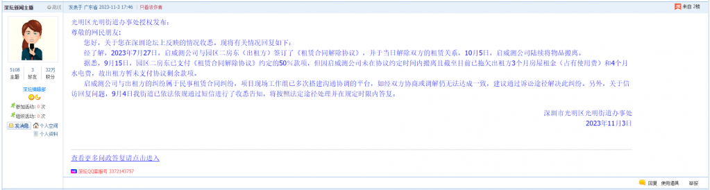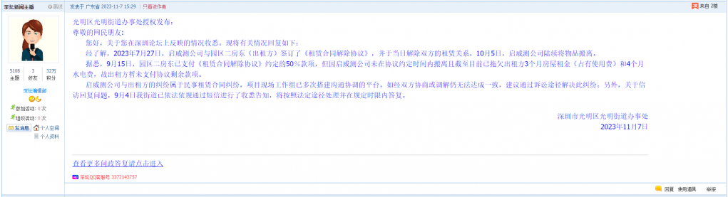 尊敬的网民朋友:您好,关于您在深圳论坛上反映的情况收悉。现将有关情况回复如下:经了解,2023年7月27日,启威测公司与园区二房东(出租方)签订了《租赁合同解除协议》,并于当日解除双方的租赁关系,10月5日,启威测公司陆续将物品搬离。据悉,9月15日,园区二房东已支付《租赁合同解除协议》约定的50%款项,但因启威测公司未在协议约定时间内搬离且截至目前已拖欠出租方3个月房屋租金(占有使用费)和4个月水电费,故出租方暂未支付协议剩余款项。启威测公司与出租方的纠纷属于民事租赁合同纠纷,项目现场工作组已多次搭建沟通协调的平台,如经双方协商或调解仍无法达成一致,建议通过诉讼途径解决此纠纷。另外,关于信访回复问题,9月4日我街道已依法依规通过短信进行了收悉告知,将按照法定途径处理并在规定时限内答复。