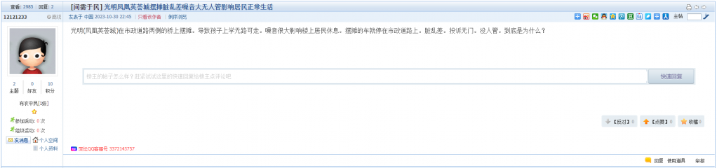 2、帖文《光明凤凰英荟城摆摊脏乱差噪音大无人管影响居民正常生活》
