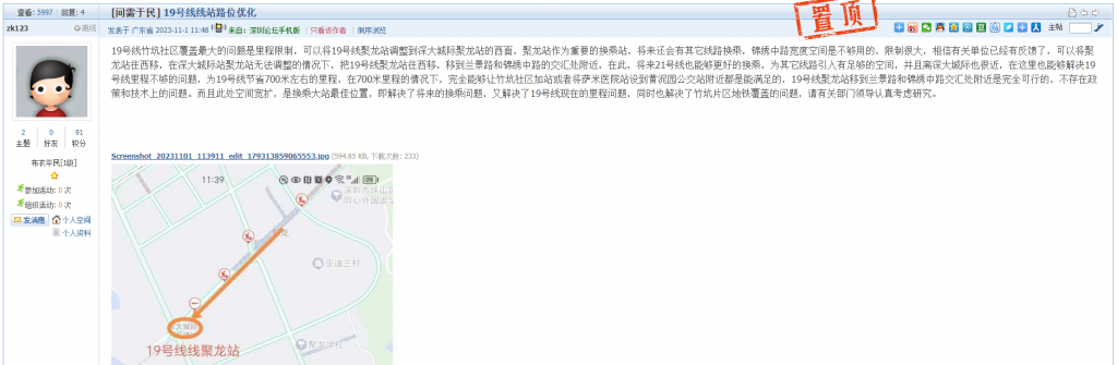 3、帖文《关于在福田区彩田路架设空中F杆指示牌的建议》