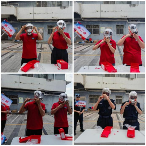 第二项是佩戴面具,选手需要快速且准确地佩戴好防毒面罩,裁判以严格的佩戴标准评比和计分,将评分结果纳入最后的成绩统计。