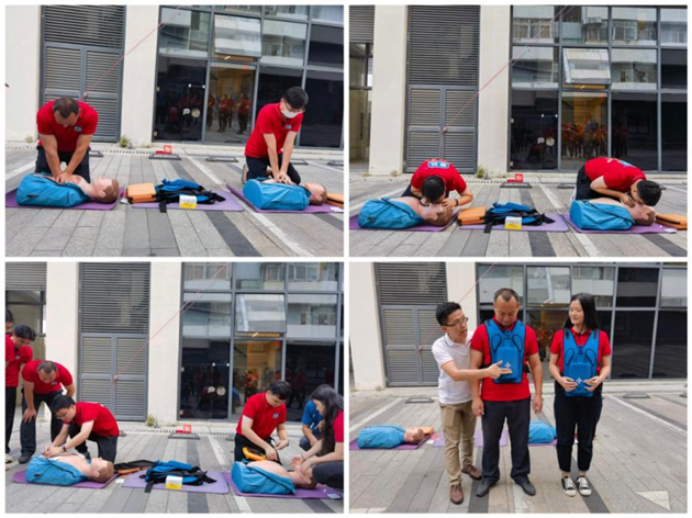 在结束三项“比武”活动后讲解并指导员工体验心肺复苏、海姆立克急救法和AED的操作方法,通过理论和实践相结合,使员工将学到的知识融会贯通,切实把应急急救知识带进家庭之中。同时,培训老师现场评比出参赛队伍的名次,并颁发了奖品。