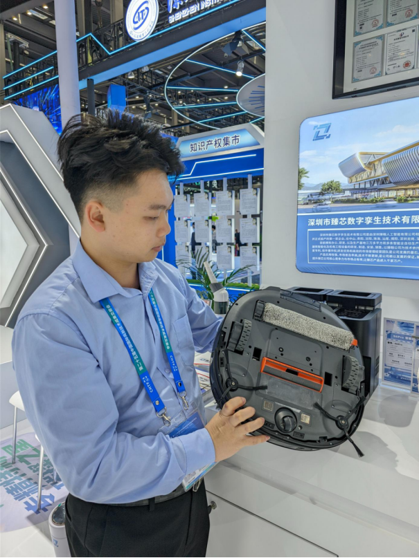 深圳市臻芯数字孪生技术有限公司在展会上展出了自主研发生产的智能扫地机器人系列。公司负责人特别介绍了最新发布的S9型号,它采用激光导航和双线激光ToF(激光测距技术),这不仅使其清洁能力更高效,还赋予了它长达180分钟的续航时间。这款高性价比的小型机器人吸引了许多路过的游客,他们排起了长队,等待着亲自试用这款智能扫地机器人。