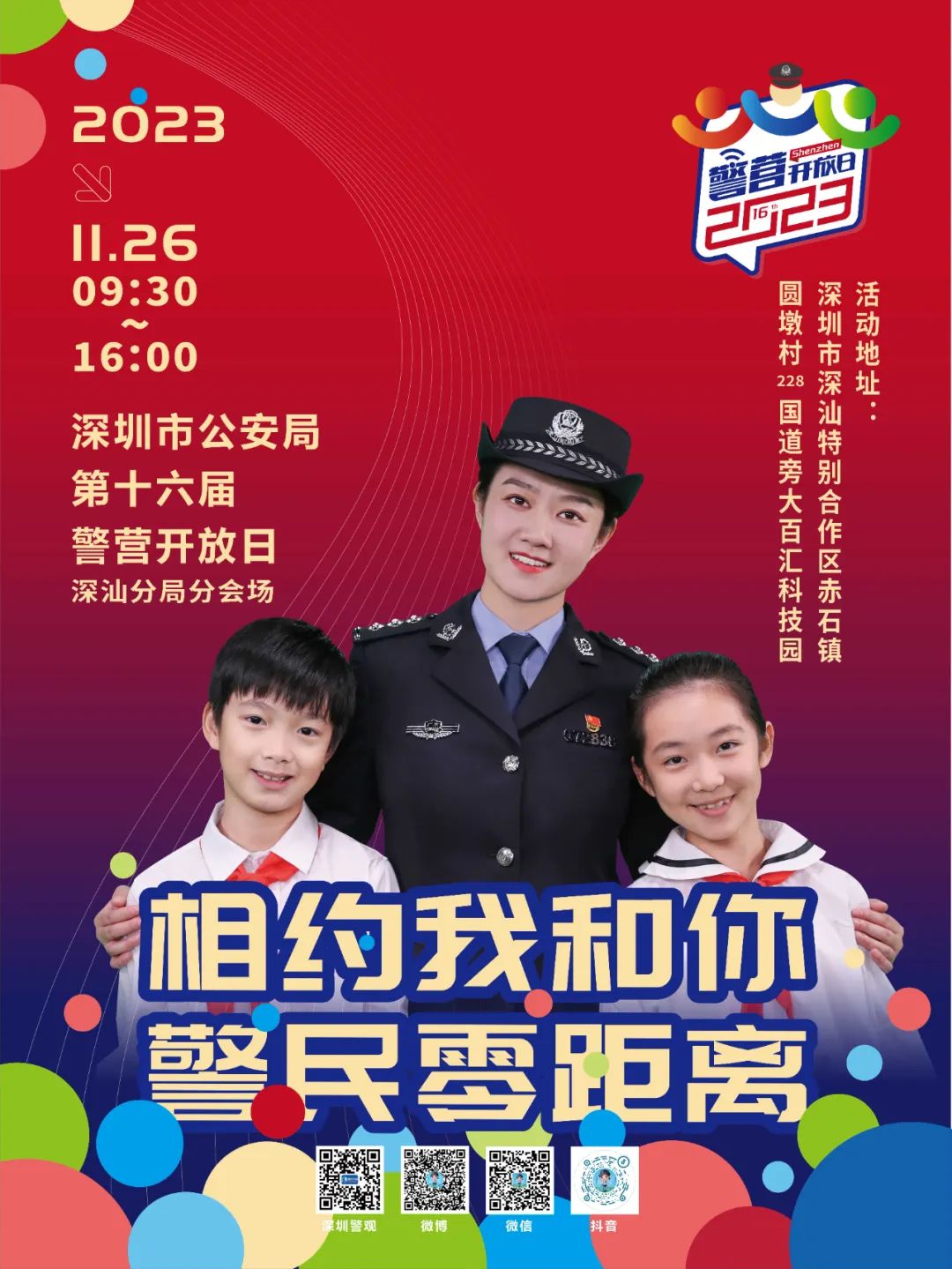 相约我和你,警民零距离。为不断深化社会各界和广大市民对公安工作的理解支持,深汕公安分局定于11月26日举办深汕警营开放日活动,让市民群众和小朋友在与警察的亲密互动中了解深汕公安工作的新发展、警务改革的新成果,进一步密切警民关系,不断提升市民群众的获得感、幸福感和安全感。无需门票、不用预约,活动诚邀你的参与!