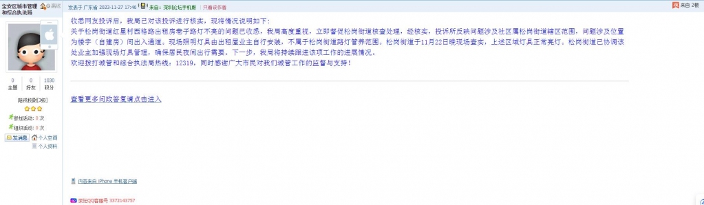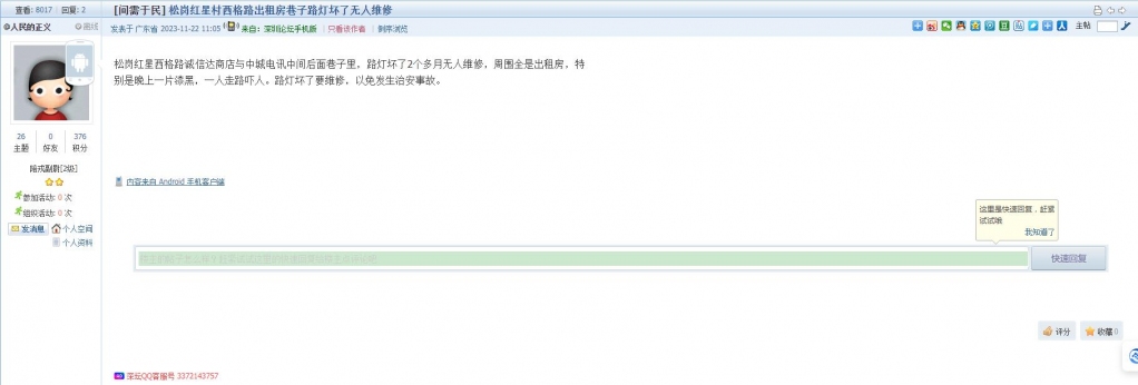 3、帖文《松岗红星村西格路出租房巷子路灯坏了无人维修》