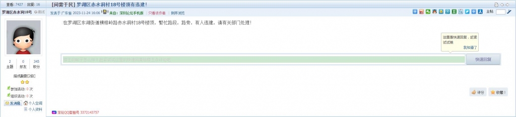 8、帖文《罗湖区赤水洞村18号楼顶有违建!》