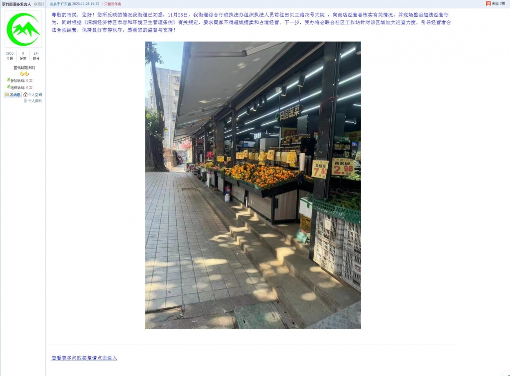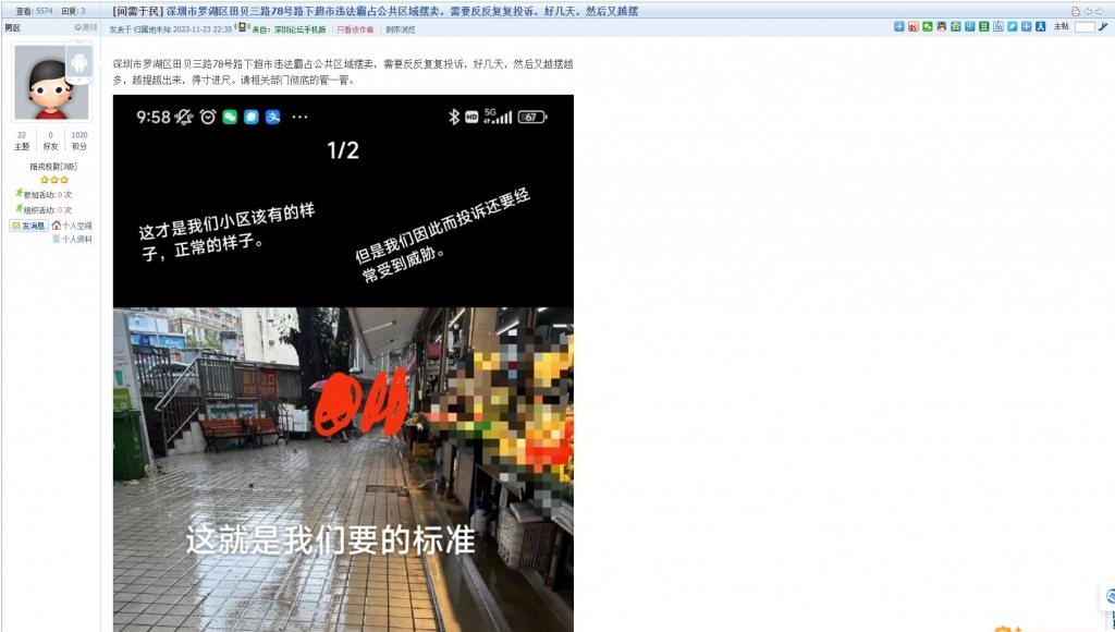7、帖文《深圳市罗湖区田贝三路78号路下超市违法霸占公共区域摆卖,需要反反复复投诉,好几天,然后又越摆》