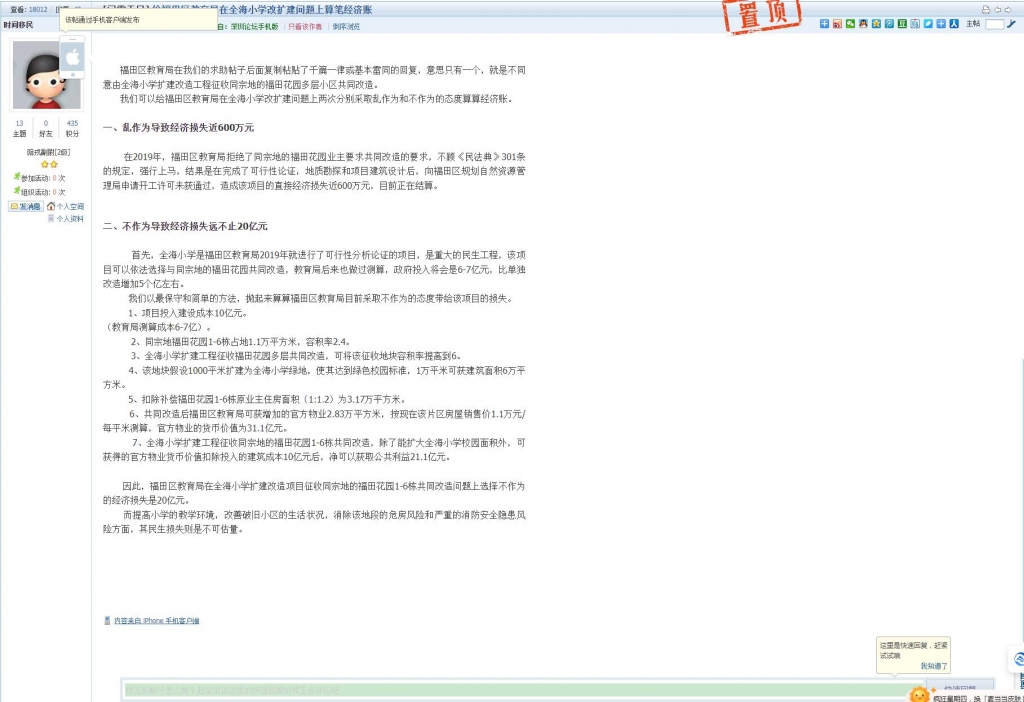 1、帖文《给福田区教育局在全海小学改扩建问题上算笔经济账》