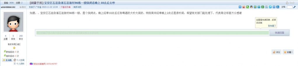 4、帖文《宝安区石岩街道石岩新村86栋一楼烧烤店晚上10点后太吵》