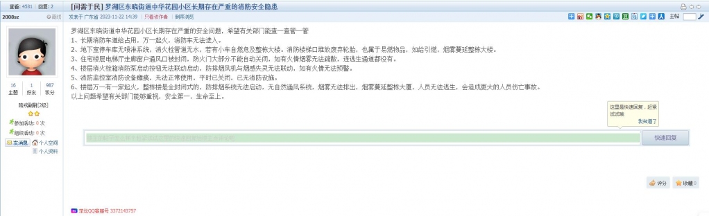5、帖文《罗湖区东晓街道中华花园小区长期存在严重的消防安全隐患》