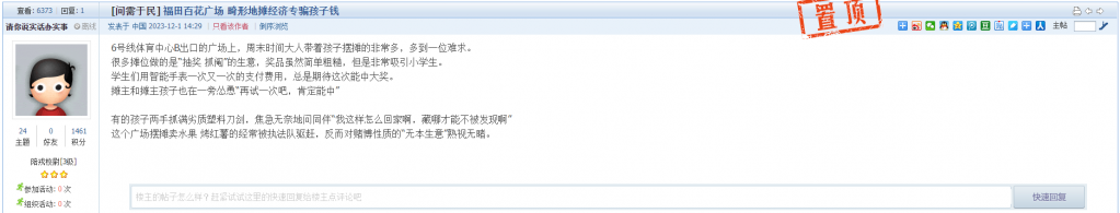 10、帖文《福田百花广场 畸形地摊经济专骗孩子钱》