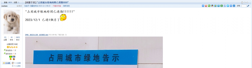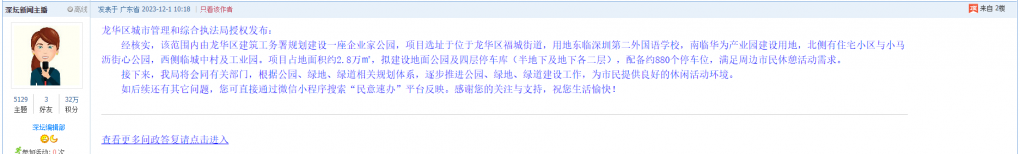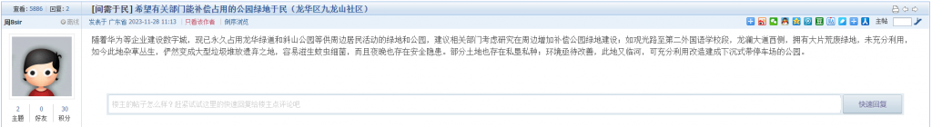 2、帖文《希望有关部门能补偿占用的公园绿地于民(龙华区九龙山社区)》