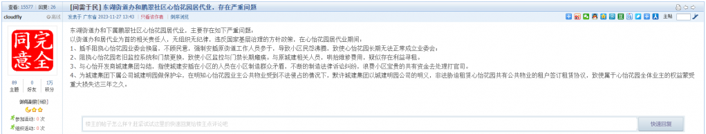 1、帖文《东湖街道办和鹏翠社区心怡花园居代业,存在严重问题》