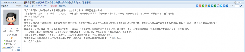 7、帖文《建议光明区公明中心商城金安路恢复原有路口,取消护栏》