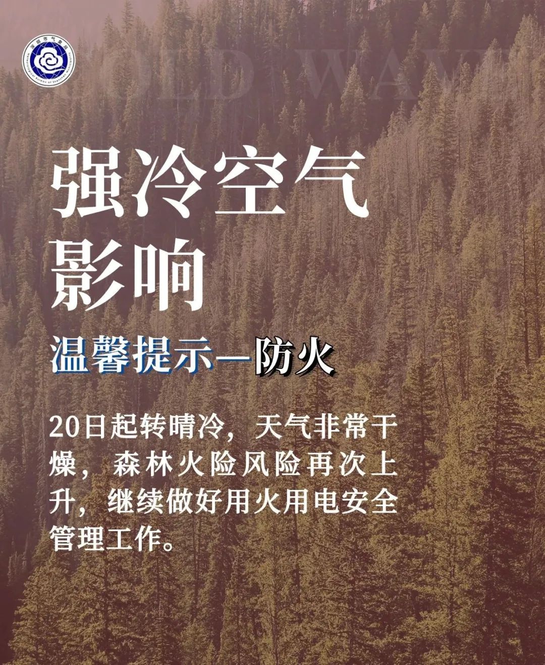 18-19日多云间阴天,气温小幅回升;展望20日受新一股强冷空气补充影响,最低气温进一步下降,转晴冷干燥天气,昼夜温差大。