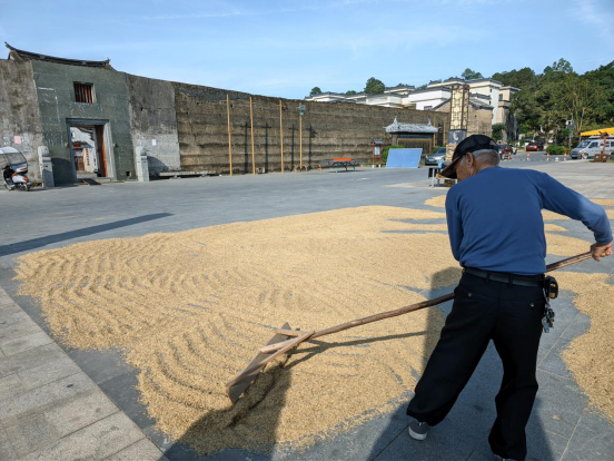 见到陈锦阮时,他正在晒谷坪上收集晒干的稻谷,铺在坪上的稻谷犹如一张金黄色的地毯。陈锦阮是赤石镇新里村村民,有3亩多耕地。由于耕地比较分散,种地收益不高,还需要耗费较多的精力去管理和维护,因此他只种了较连片的地块,一些距离较远的小地块一度撂荒了。
