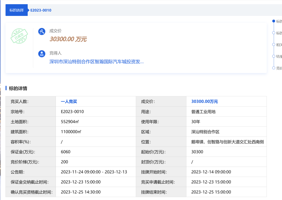 智瀚国际汽车城公司是深汕国际汽车城(集团)有限公司旗下子公司,摘得E2023-0010宗地后将为协鑫(集团)控股有限公司“定制代建”百亿级储能基地项目。