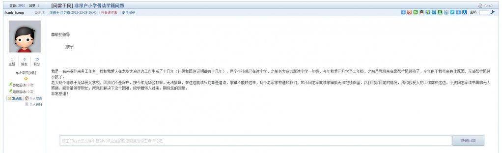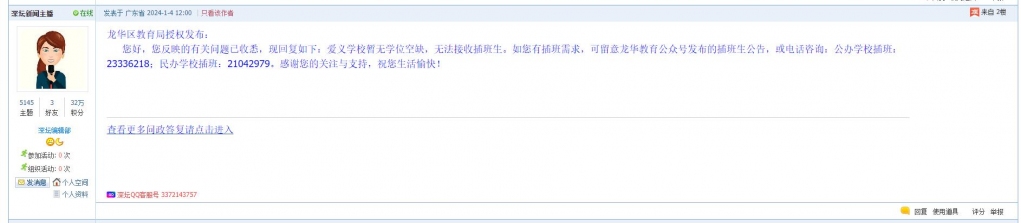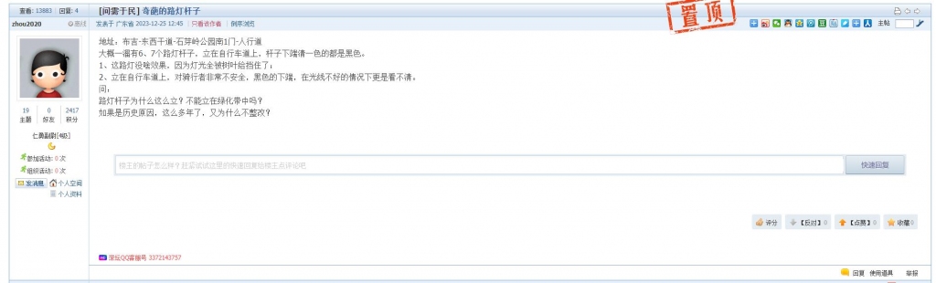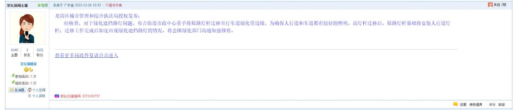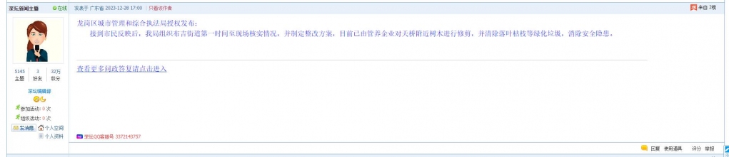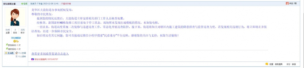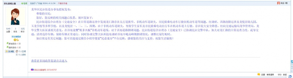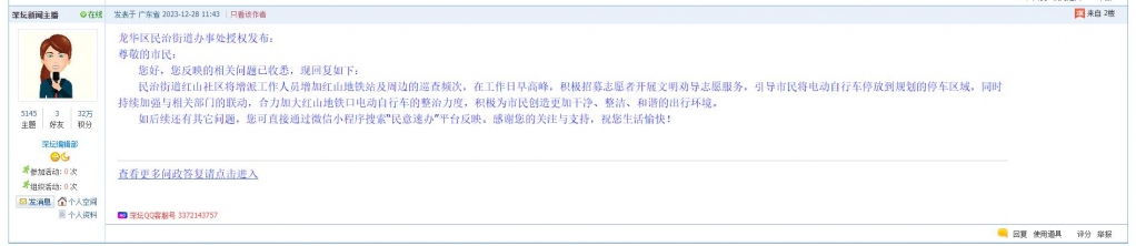 各职能单位如需对网友反映的问题进行回应,可在深圳论坛注册官方账号并通过认证,回帖进行回应。