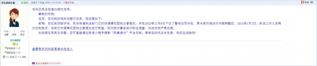 前期,在收到该投诉后,民治街道执法部门已约谈通博花园物业管理处,并在2023年12月6日下达了警告处罚决定,责令其对违法行为限期整改。2024年1月3日,执法工作人员再次收到投诉,目前已对通博花园物业管理处进行核查,拟对投诉事实进行取证调查,依法依规严肃处理。