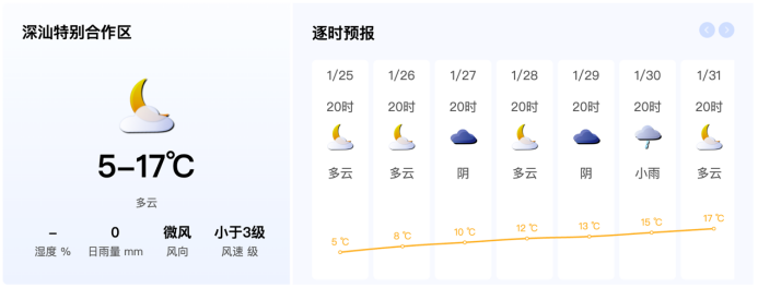 据市气象局深汕气象工作组消息,今日早晨已出现本次过程最低气温。预计今天夜间气温较昨日小幅上升,25日早晨最低气温5℃左右,体感仍非常寒冷;白天可见阳光,最高气温可上升至14℃左右,昼夜温差加大。深汕特别合作区寒冷橙色预警信号继续生效中。