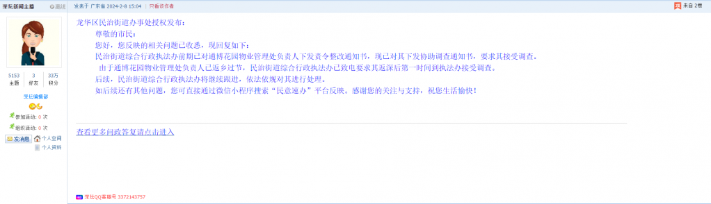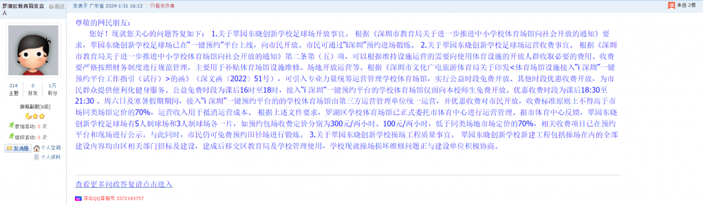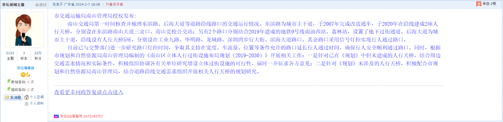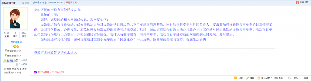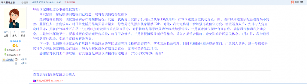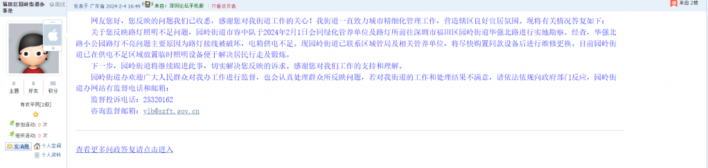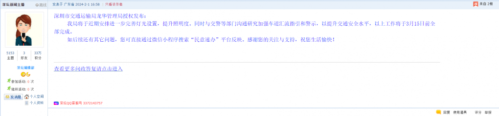 各职能单位如需对网友反映的问题进行回应,可在深圳论坛注册官方账号并通过认证,回帖进行回应。